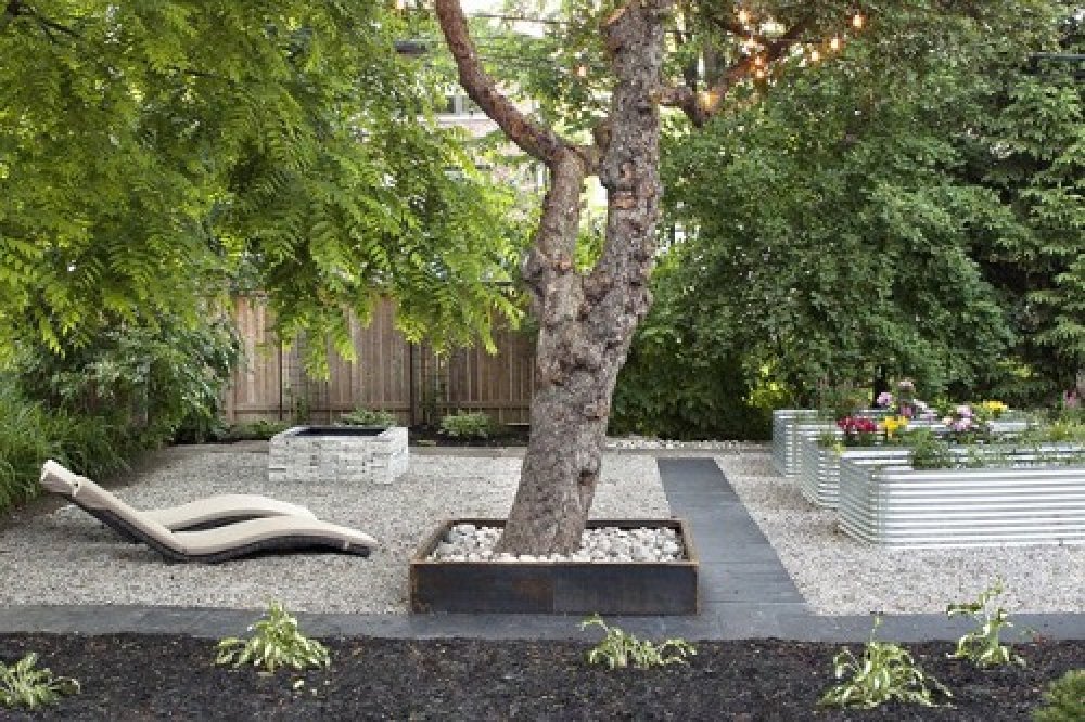 Start with laying the concrete base. Spread limestone screenings as the top base. Install steel planters where you can grow flowers and veggies to add that pop of colour. If you have a tree in your backyard, build a low-rise planter around it and add some riverstone for a touch of tranquility. Complete the look with some patio furniture and enjoy your new backyard!