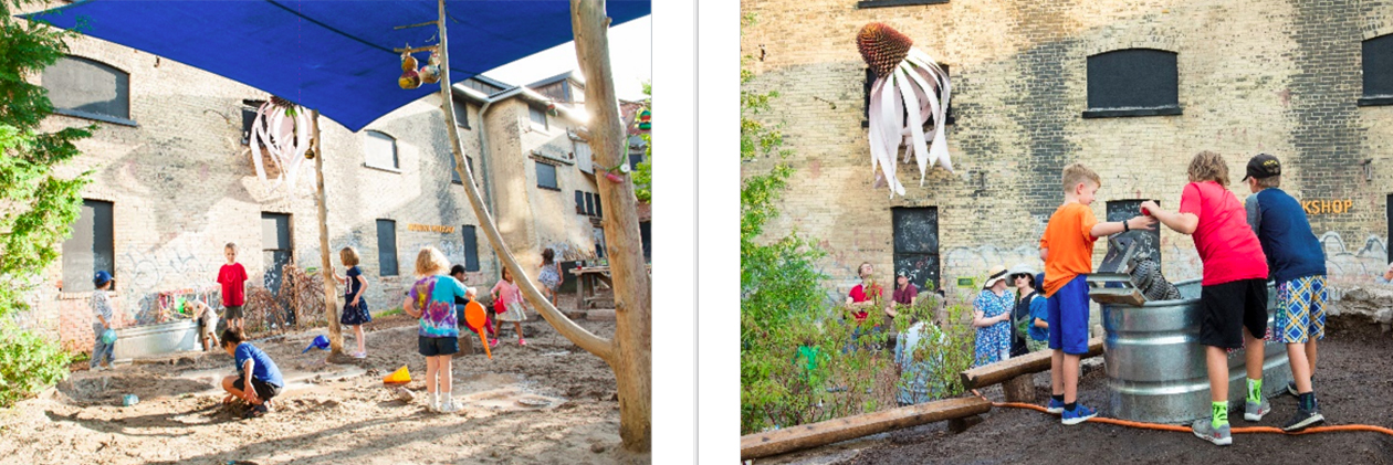 Evergreen is also striving to build the infrastructure and programs to create these opportunities at Evergreen Brick Works, the charity’s dynamic home in the heart of Toronto’s Don Valley. When the Children’s Garden opened at Evergreen Brick Works in 2010, it was envisioned to be a testing ground for new innovations in outdoor play and learning. The space itself is a unique combination of place-based education, loose parts play and a site design that evolves with the seasons and user interaction.